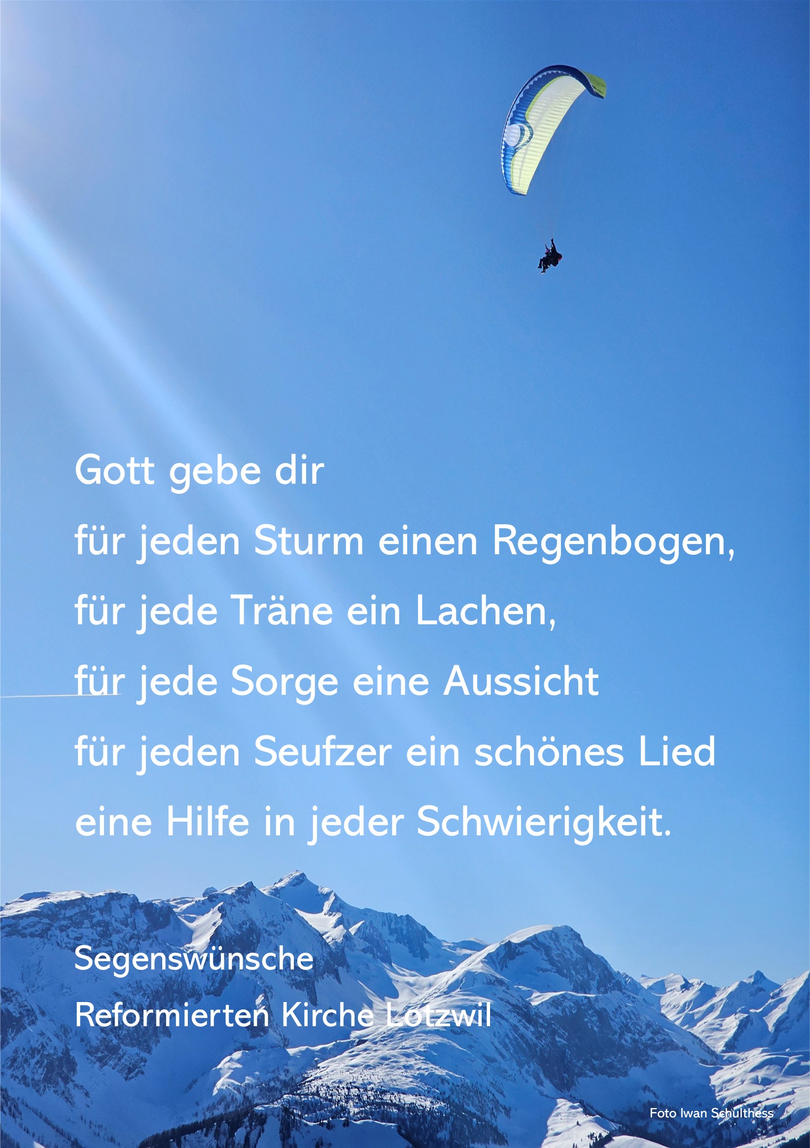 Über dem Tor zum Neuen Jahr glüht der Regenbogen Hast du ihn gesehen? Gott gebe dir für jeden Sturm einen Regenbogen, für jede Träne ein Lachen, für jede Sorge eine Aussicht für jeden Seufzer ein schönes Lied eine Hilfe in jeder Schwierigkeit. Zum Monatsspruch...