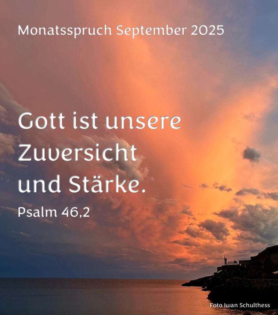 Monatsspruch September 2025 Gott ist unsere Zuversicht und Stärke. Psalm 46,2 «Redbull verleiht Flügel» So verkündet die Werbefloskel. Wir brauchen kein Redbull, um stark zu sein, sagen dagegen die betenden Menschen im Psalm 46: Gott ist unsere Zuversicht und...